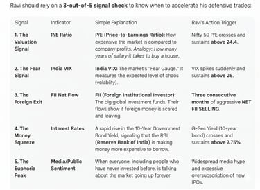 Your Trigger: When the Nifty 50 P/E crosses and sustains above 24.5 for a few weeks, it's a strong red flag that the market is becoming overvalued. This is your cue to accelerate Trade 1 (cash conversion) and consider Trade 3 (Put Options).